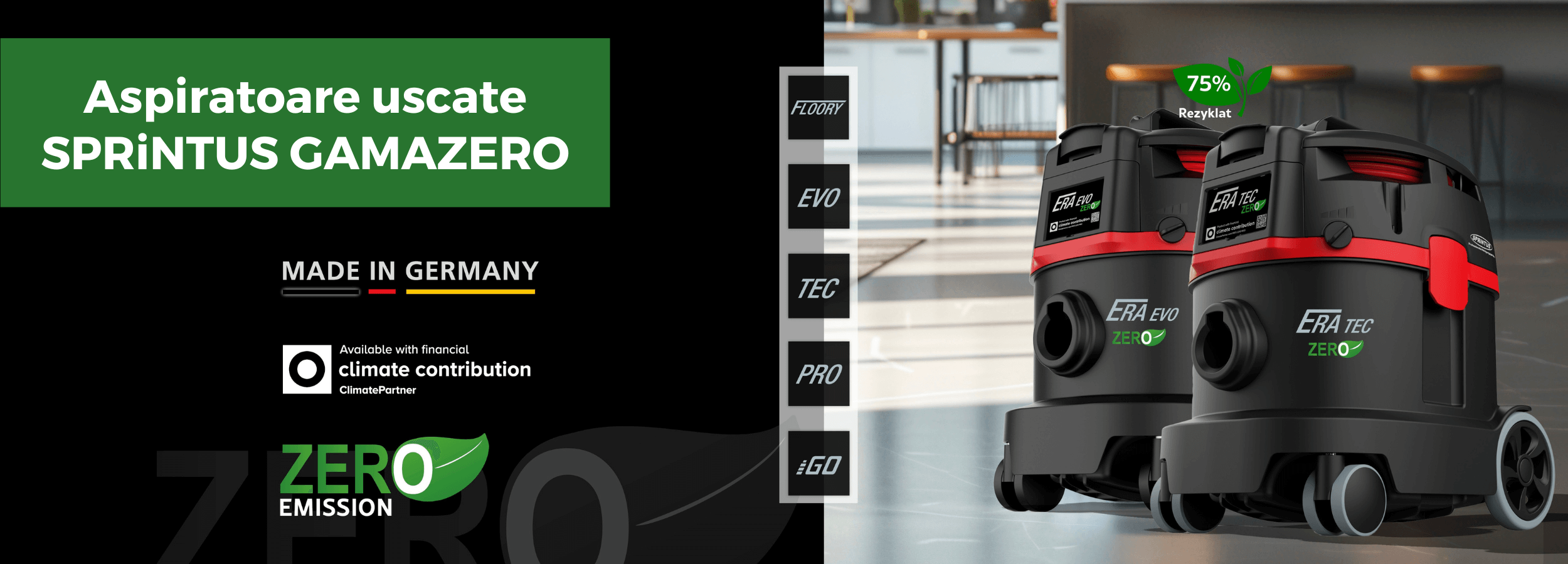 Conceptul ZERO înseamnă zero emisii de CO₂. SPRiNTUS minimizează emisiile generate pe întreg ciclul de viață al produsului, de la extracția materiilor prime și procesul de producție, până la reciclarea și gestionarea responsabilă a echipamentului și ambalajelor la sfârșitul duratei de utilizare.