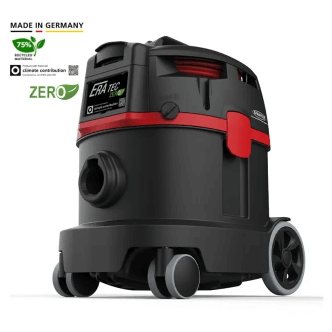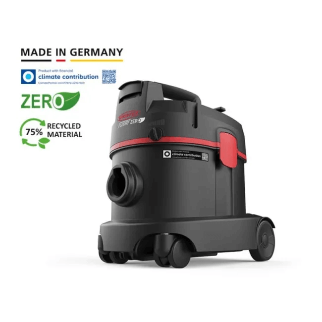 Pentru realizarea aspiratoarelor uscate ZERO se utilizează până la 75% plastic reciclat, reducând semnificativ consumul de materiale prime noi și impactul asupra mediului. În plus, toate aspiratoarele sunt fabricate în Germania, la sediul companiei, ceea ce permite colaborarea cu furnizori regionali, reducerea ambalajelor și optimizarea transportului.